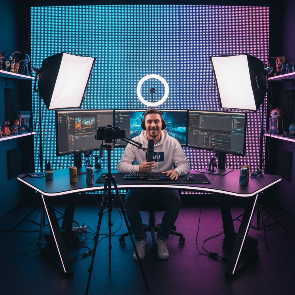 Gaming setup with RGB lighting in background, medium close-up, energetic atmosphere.