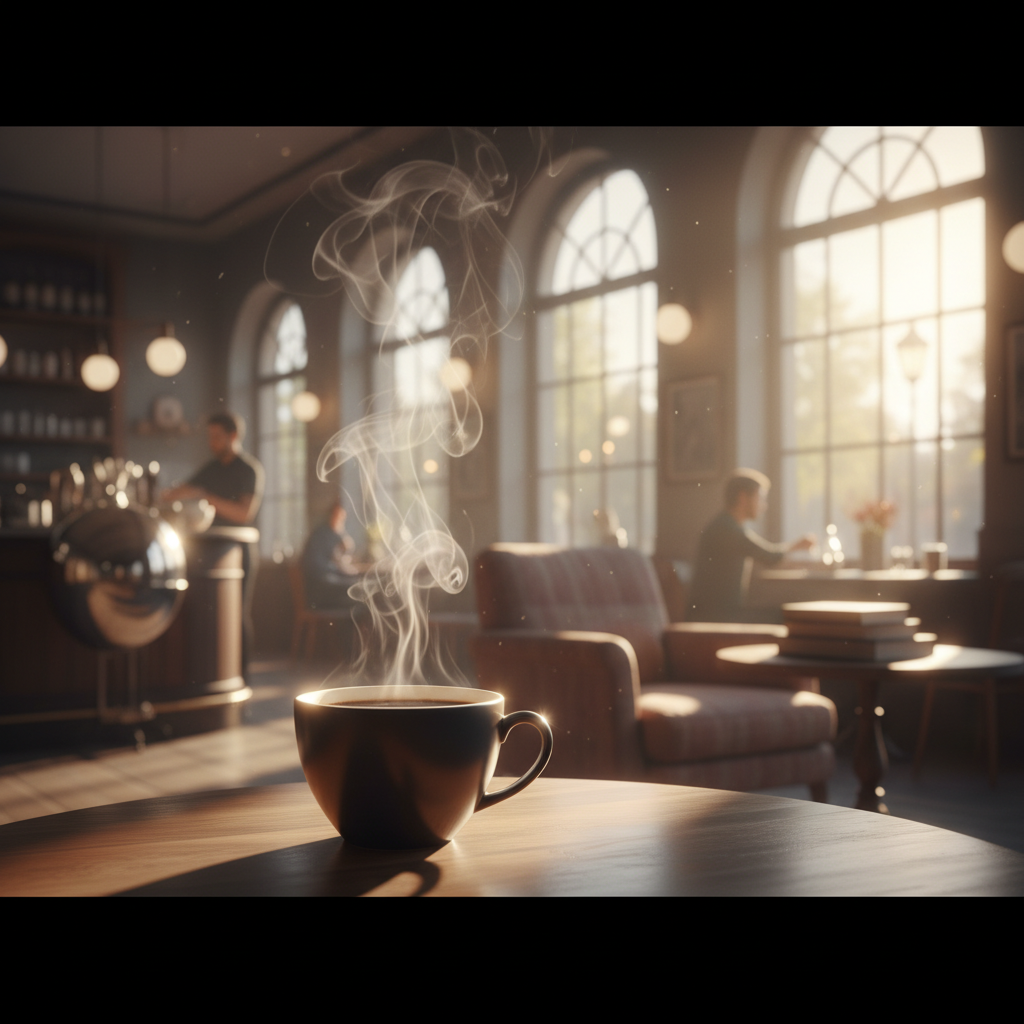 Strong: "Slow dolly in on a ceramic coffee cup on a wooden cafe table, steam rising, morning sunlight through window, shallow depth of field, 35mm film look"
