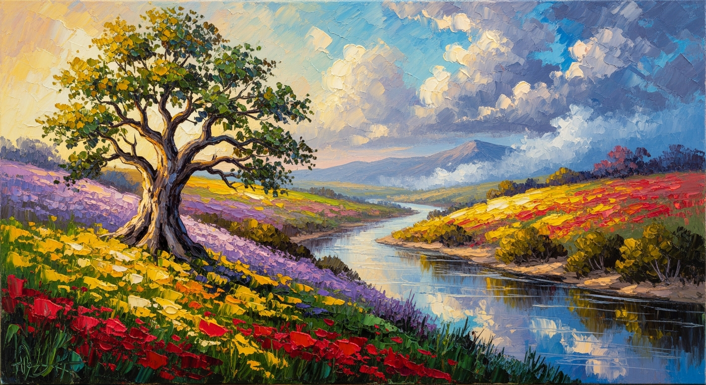 "Classical oil painting with visible brushstrokes, rich warm tones"