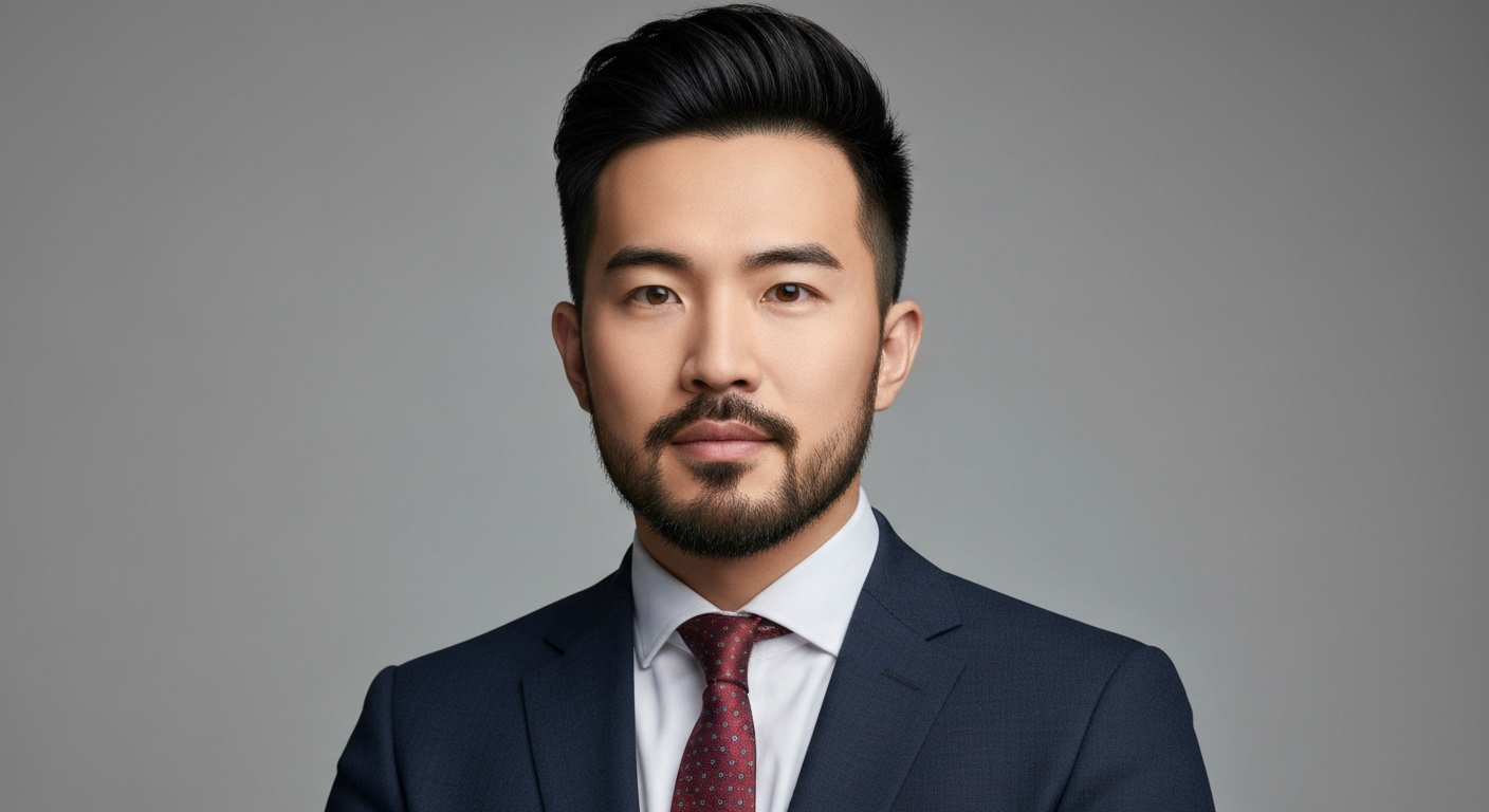 hair and neatly trimmed beard, wearing a navy blue suit with white shirt,