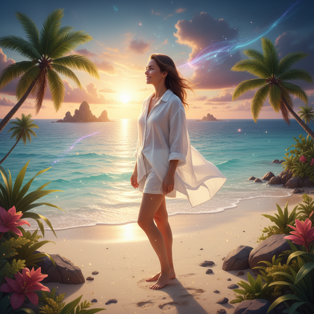 Replace the background with a warm sunset beach. Adjust the subject's