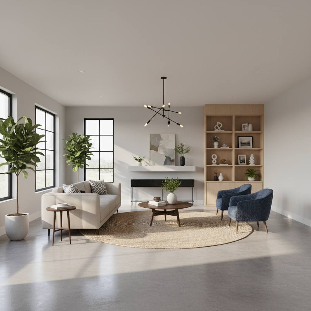 table, a soft wool rug, and a tall plant in the corner. Add warm